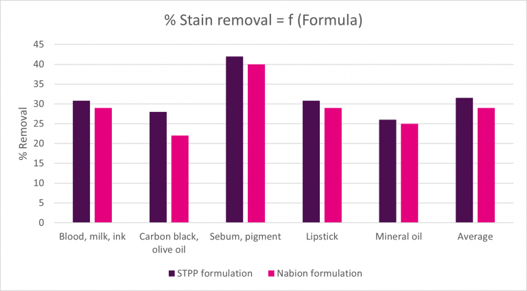 Nous avons comparé le pouvoir détachant de deux formules : l’une à base de STPP (tripolyphosphate de sodium) et l’autre à base de Nabion®. Le pouvoir détachant est quasiment identique entre la formule à base de STPP et celle à base de Nabion®. Le STPP ou tout autre agent de construction peut donc être totalement ou partiellement remplacé par Nabion®, en ajustant les autres composants pour équilibrer la formule, tout en réduisant le coût global.